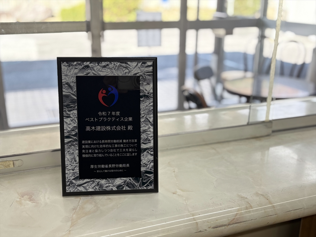 2025年11月20日、当社は「地域の中で長時間労働削減に積極的に取り組む企業」として、長野労働局様より令和7年度のベストプラクティス企業に選定されました。建設業としては初めての選定ということで、私たちにとって大きな励みとなりました。