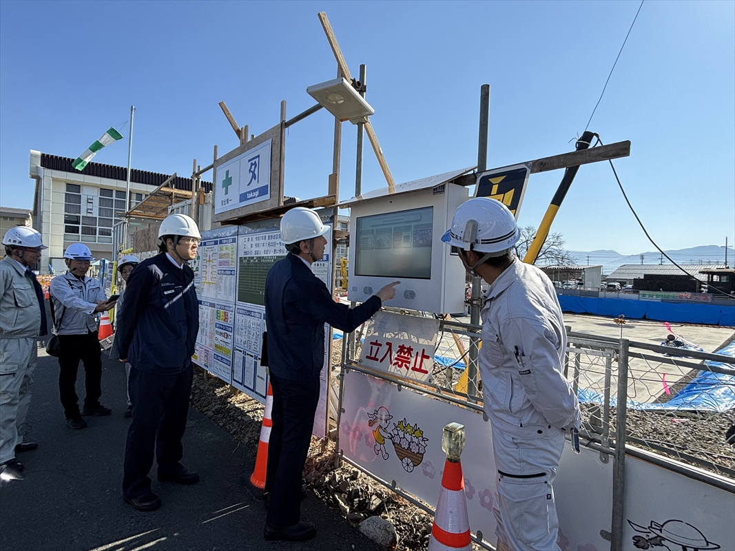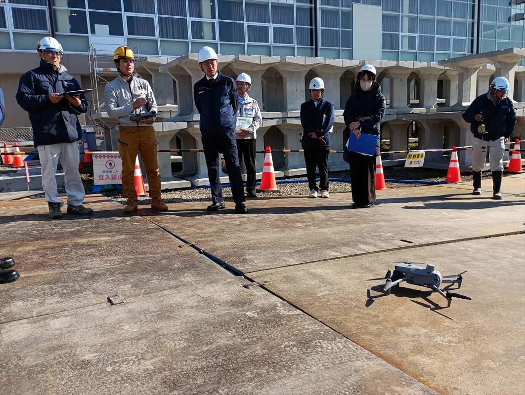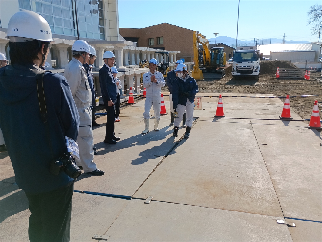 意見交換会の後は、豊野地区で施工中の現場へ移動し、社員による業務効率化の実演が行われました。 ドローン活用による現場の3次元データ化、現場サポーターの活躍、デジタルサイネージの活用など、説明には若手社員も参加し、導入のメリットや反響などを説明していました。