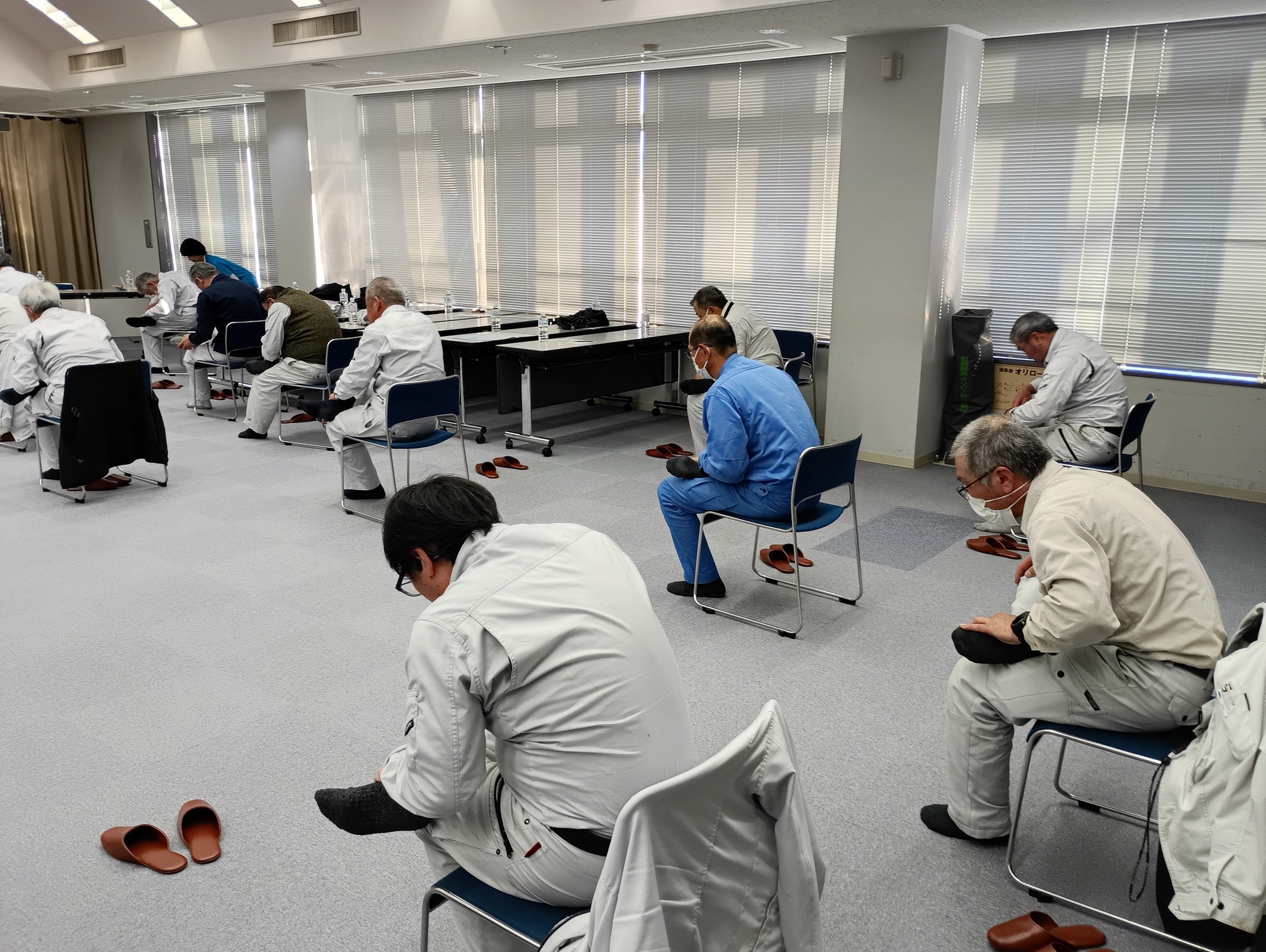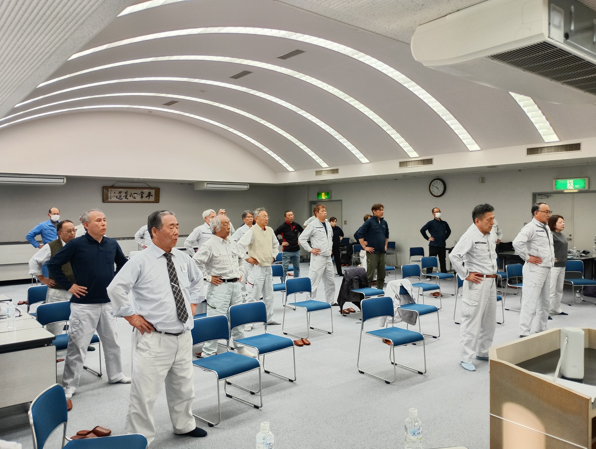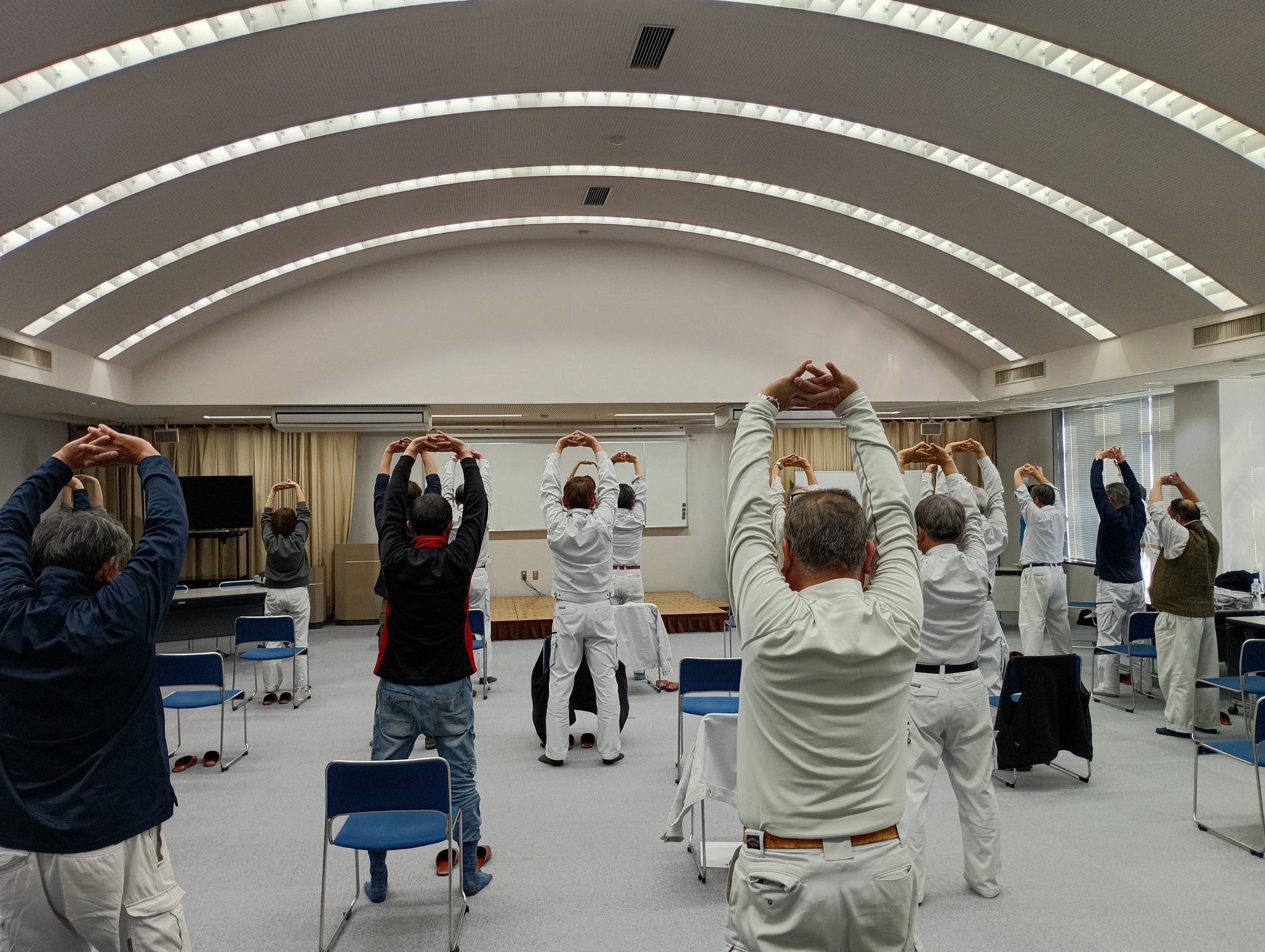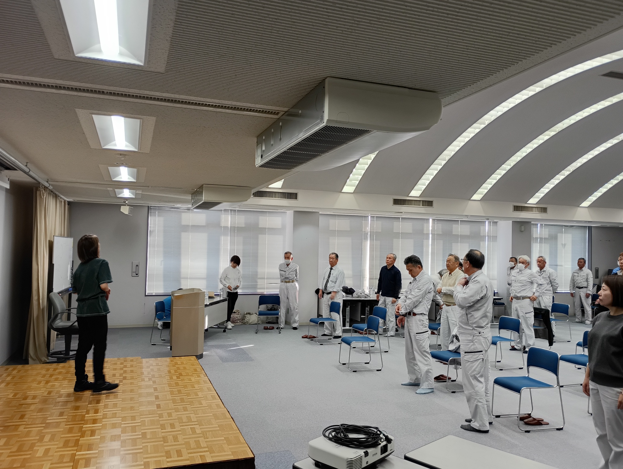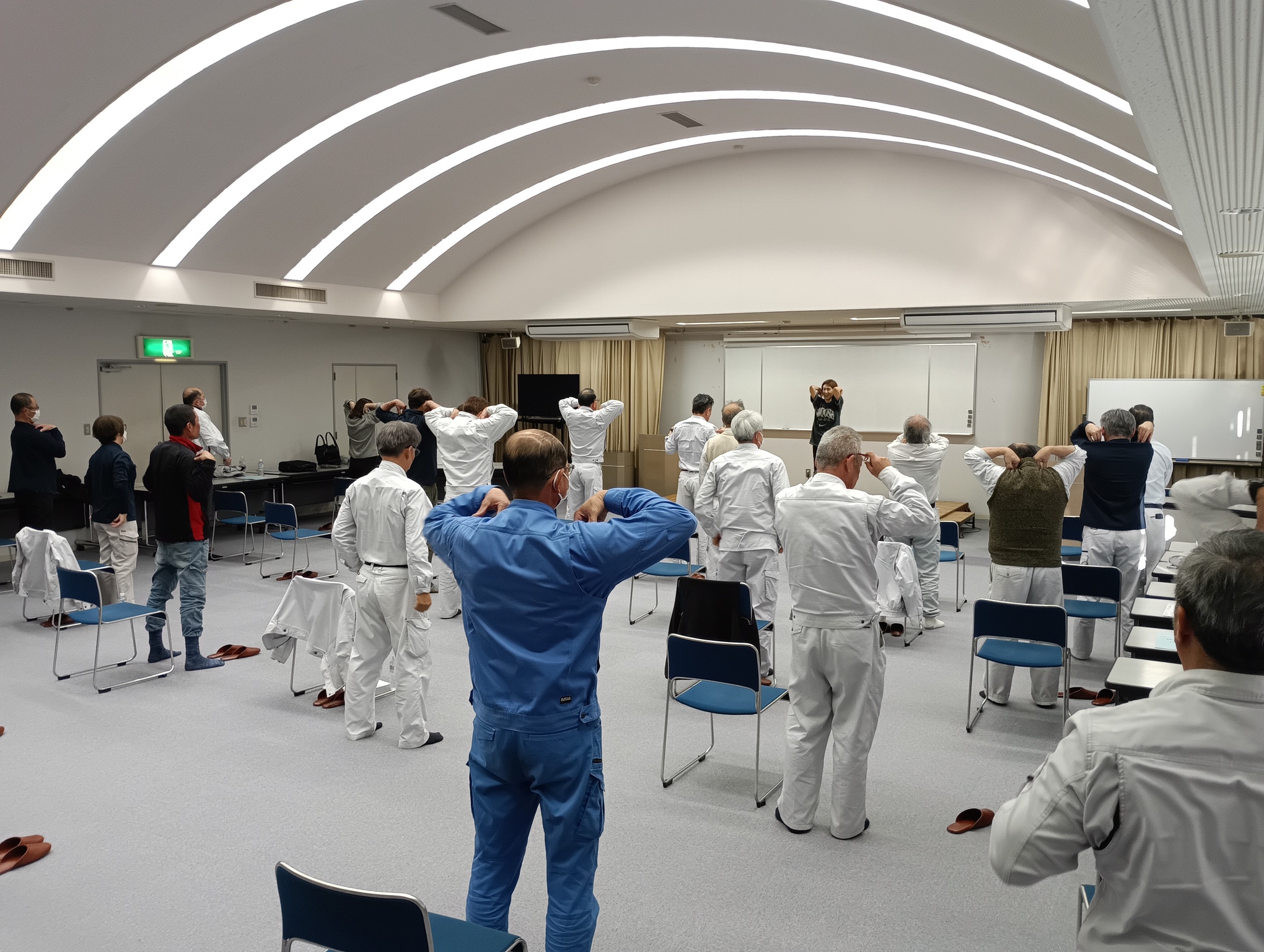 また、実技指導では、転倒予防や体力維持を目的とした運動を行い、椅子に座ったままでもできるストレッチや軽運動など、日常生活や業務の合間にも取り入れやすい内容を指導いただきました。