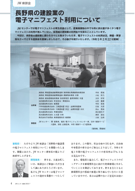 2023年2月22日、電子マニフェストを運営している公益財団法人日本産業廃棄物処理振興センター(JWセンター)様が主催する「長野県の建設業の電子マニフェスト利用について」の座談会に参加して参りました。 …