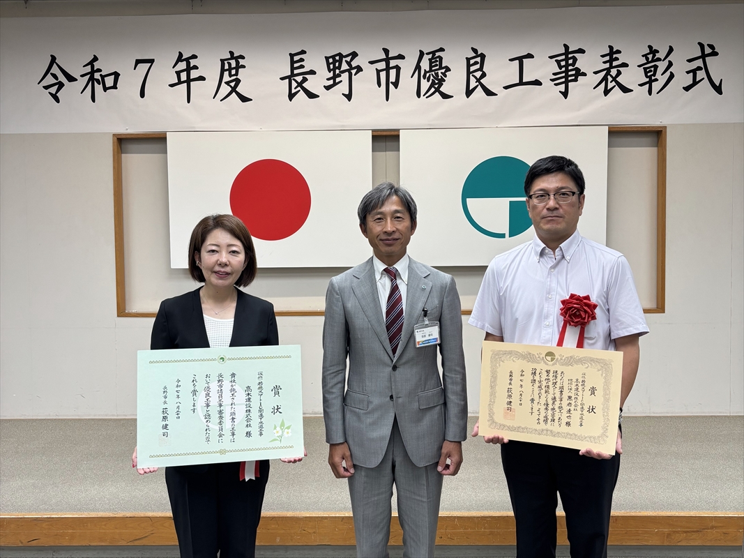 令和7年度 長野市優良技術者表彰を受賞しました。 2025年8月20日、長野市役所にて表彰式があり、今年は令和6年度に竣工した714件の工事の中から特に優れた12件の工事が選ばれました。当社では、土木 …