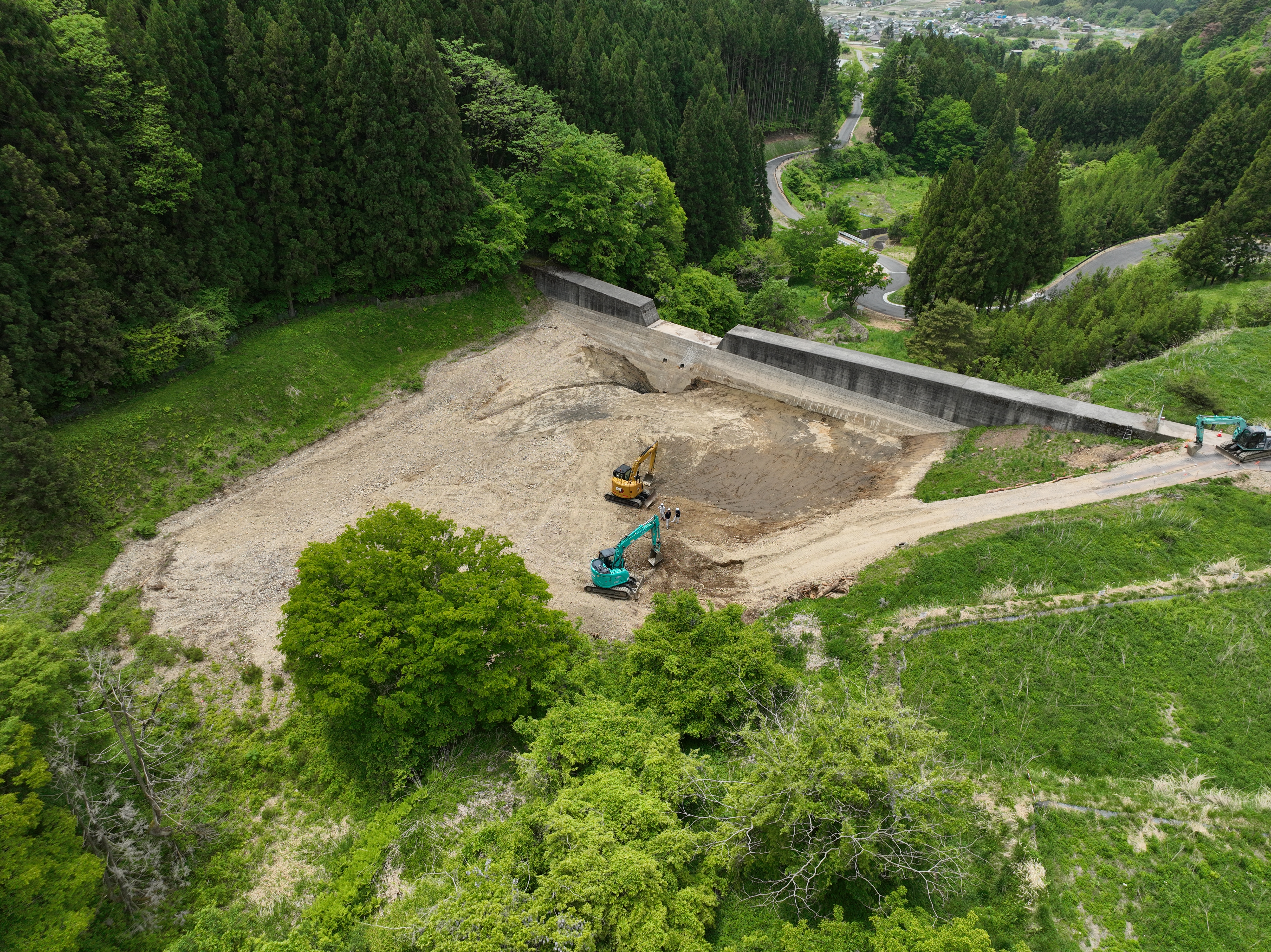 土石流による土砂災害を防ぐための工事です。 砂防堰堤(さぼうえんてい)は、土石流が流れてきた時にそれを谷の途中で受け止めて、皆さんの生活を守る役割があります。